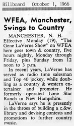 In 1965 Charlie Shoe replaced Jim Camilli as program director, but he was stolen by WKBR program director Eddie B. Baker (another ex-WFEA DJ) in mid 1966. Many people found themselves in WFEA's driver's seat during the 1960s. It's unclear which of them made the decision to depart with continuous Top 40 music in October 1966. Gene LaVerne was associated with the station for 20 years off and on, starting as a singing cowboy and later spinning pop hits. Suddenly the Top 40 format was interrupted by country and western music every weeknight from 7PM-midnight.