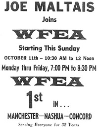 As WFEA began the 1960s, it leaned heavily on the Top 40 music that was sweeping America. While providing news and public affairs programming, the thrust was primarily rock and roll. Under Bill Malo and Frank Pellegrin's WFEA Broadcasting Corp., the station developed a reputation for being something of a revolving door for young disc jockeys. On-air stays were often short. Sometimes individuals left and came back; for example Jack Miller sat out parts of 1962-63 while he served his military obligation. There were at least three Jim Longs at WFEA (Don Davis and Pete Morrison were two of them). From 1960-65, programming was under the direction of Jim Camilli, a fast talking DJ who came from upstate New York. He employed whatever slick promotional ideas were sweeping the industry at the moment. Management wasn't above raiding the competition. In late 1964 WFEA stole WKBR's popular French-language music host, Joe Maltais.